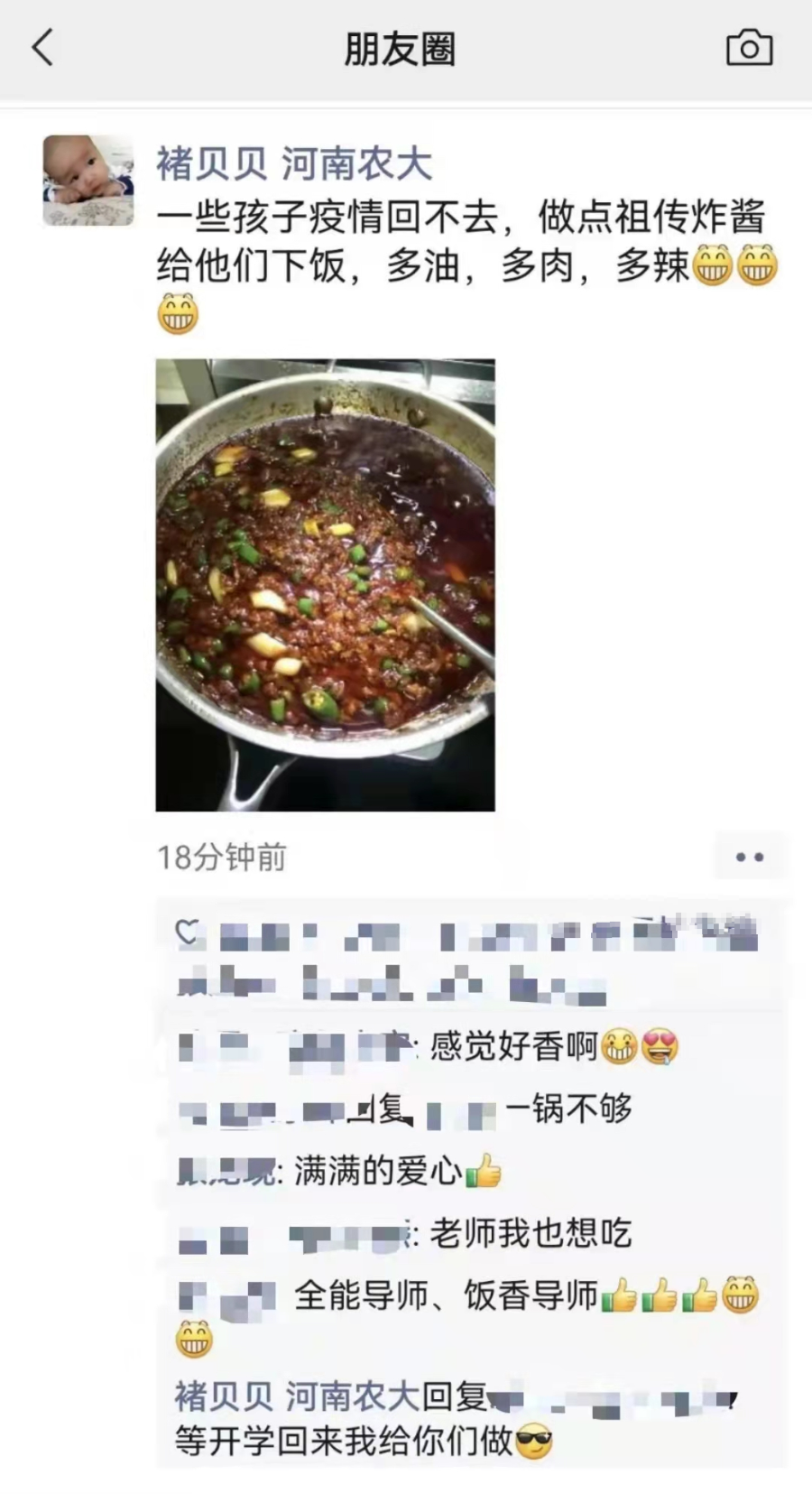褚贝贝老师平日里对学术一丝不苟,要求也十分严格,但在生活中对我们却是诸多关爱。2021年7月20日郑州大雨期间,连日的暴雨使得农大校园变成一片泽国,行动十分不便,同学们常常因滂沱的大雨或者因专注于实验而错过饭点。这时,褚老师担心连日的大雨给课题组学生的生活造成不便,她便亲自为我们送来方便面、火腿肠,以免因大雨而影响学生们按时吃饭。2022年初,郑州疫情形式复杂严峻,在学校已经放假的情况下,课题组的同学们仍然坚守在科研一线,褚老师在对我们进行悉心指导的同时,又在百忙之中抽出时间买来原料,并亲自下厨,为我们做了一份她十分拿手的肉酱,还亲自送到实验室供我们下饭。肉酱冒着热气,香味从锅里喷涌而出,香嫩的肉入口即化,再配上尖椒,十分可口。褚老师亲手做的肉酱受到了同学们的一致认可,在实验室里很快便被我们一扫而光,她还说:“要是认可我的手艺,吃完我还给你们做。”褚老师不仅在教学科研上给我们做出了表率,这次更是秀了一把厨艺,展现了她的多才多艺。即使是在寒冷的冬日,导师的亲切关怀和温情也令我们倍感温暖。