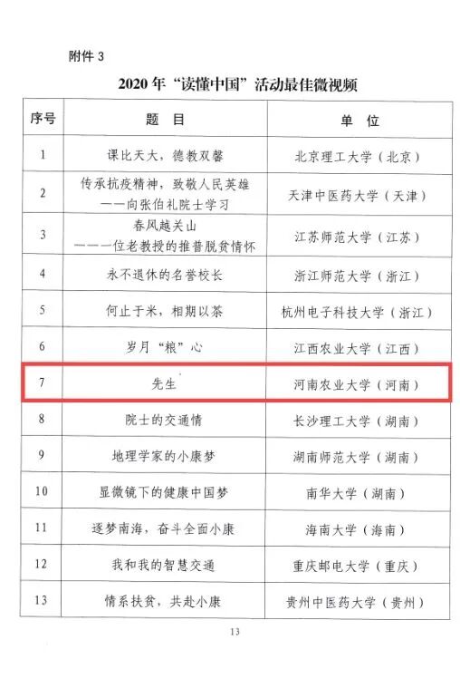 近日,教育部关心下一代工作委员会公布2020年“读懂中国”活动评审结果,2020年各省和直属高校共报送征文493篇、微视频265个、短视频46个、舞台剧22个。由麻将线上玩 出品的《先生》获最佳微视频(全国共30个)。